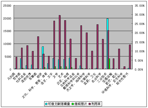 由学科分类利用数据得知,文献利用率最高的学科是文学类,达29.43%;其次是艺术类和语言文字类,利用率分别为26.72%26.462%;医药卫生类文献利用率为24.51%,利用率相对较少的为环境科学和安全科学类。